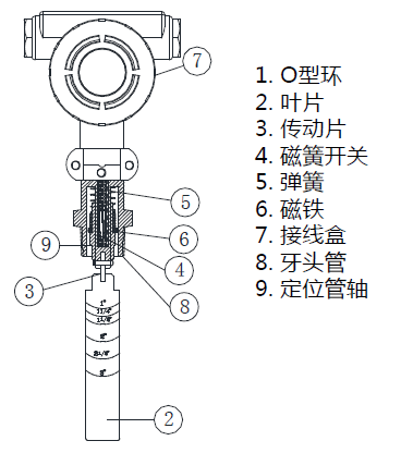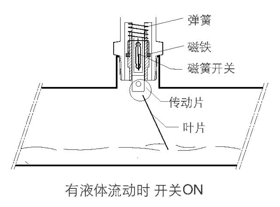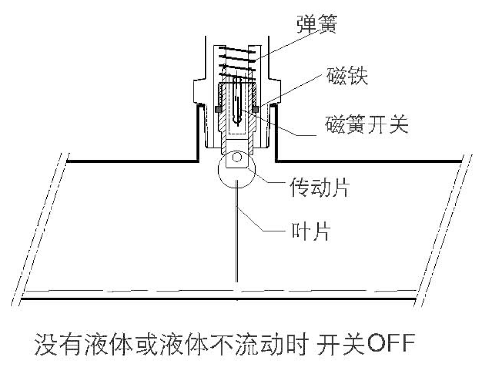 葉片式流動開關(guān)是利用水的流動力量帶動葉片,來測試管內(nèi)液體是否流動,當(dāng)液體在管路內(nèi)沒有流動時(shí),彈簧將磁鐵往下壓葉片成垂直,此時(shí)磁簧開關(guān)無動作,接點(diǎn)在常開(NO)位置。當(dāng)管路內(nèi)有液體流動且液體流量足以將葉片推高約20°~30°時(shí),葉片上方至偏心傳動片將磁鐵往上推,而磁鐵的吸力使磁簧開關(guān)動作,此時(shí)接點(diǎn)接通(close)。由于管徑的不同葉片長度也要隨之改變。